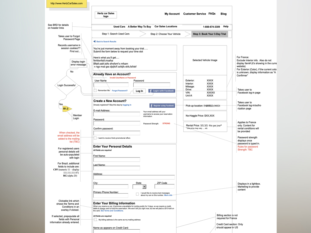 example UX story: {Customers} have full use of the vehicle for up to three days and if he/she chooses to purchase the vehicle, they simply keep the car and pay the listed price without any haggling and the rental fee is waived. If the customer decides not to purchase the car, the vehicle is returned to the renting location and the transaction is treated as a standard rental with a $XX per day rental fee.
